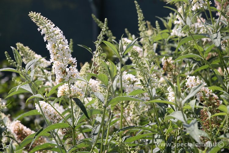 3-4 m magas, erős növekedésű cserje. Fehér bugái kecsesek, az elnyílt virágok nem barnulnak meg. Várostűrő. Tavasszal erősen vágjuk vissza.