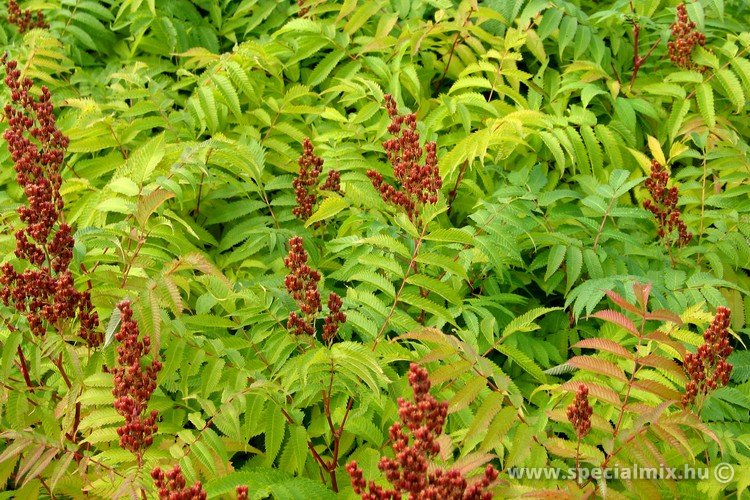 1 m magas, kompakt bokor. Levelei páratlanul szárnyaltak, világoszöldek, a fiatal levelek bronzos színe éles kontrasztot ad. 10-15 cm-es krémfehér, ágvégi fürtös virágai július-augusztusban nyílnak. Õszi lombszíne élénkpiros.
