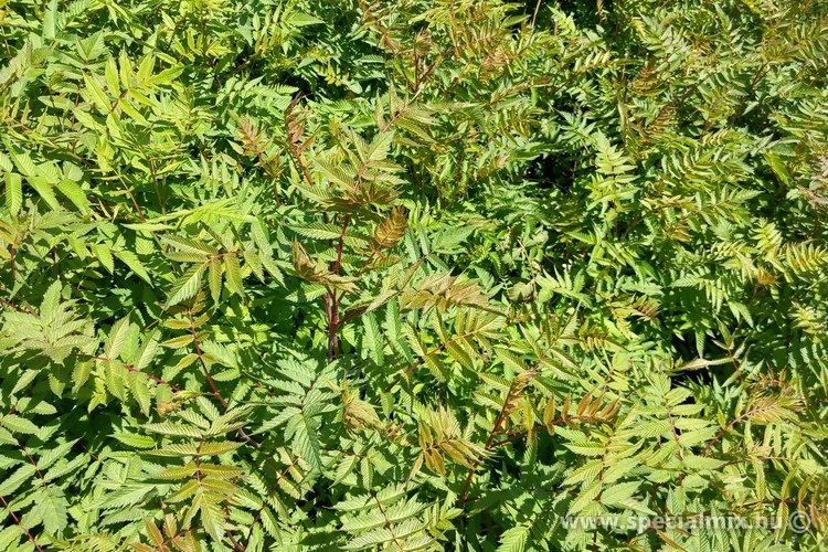 Elsősorban levelével, a levél textúrájával és üde zöld színévell díszítő, sűrű, kerekded bokrot alkotó törpecserje. Páfrányszerű levelei kihajtáskor pirosas/narancsos árnyalatúak, később friss zöldek. Gyenge növekedésű, kerekded formáját folyamatosan megtartja. Mérsékelten virágzik, fehér fürtvirágzata júniustól nyílik. Üde, jó vízáteresztő képességű talajba ültessük napos/félárnyékos fekvésbe. Alacsony sövény, talajtakaró, konténeres növény lehet.