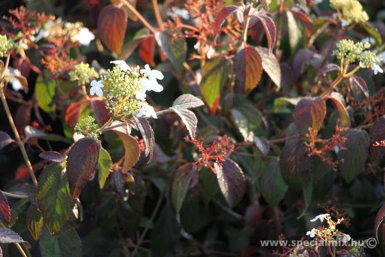 1,5–2,5 m magas, gömbölyded alakú lombhullató cserje, közel vízszintesen álló ágakkal. Levelei széles tojásdadok, ősszel lilásvörösre/rőtvörösre színeződnek. Fehér virágai május-júniusban nyílnak, a széleken nagyobb, meddő virágokkal. A virágokból nyár végére élénkpiros termések fejlődnek. Üde, tápdús, laza szerkezetű humuszos kerti talajt, napot/félárnyékot, párás környezetet igényel.